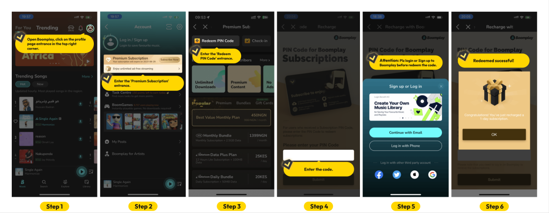 Once you’ve successfully requested your Boomplay reward, you’ll receive your reward code within 24 business hours. Follow the steps below to start enjoying the #1 music streaming app in Africa, with top Afrobeats, hip hop, and more.